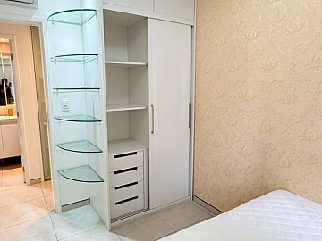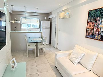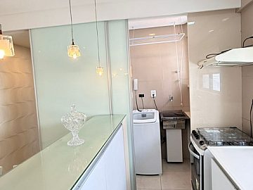O apartamento, totalmente mobiliado, dispõe de 2 dormitórios, sendo 1 suíte, 2 banheiros e 2 salas, proporcionando espaços bem definidos para o convívio social e o descanso. A cozinha americana, integrada à sala, otimiza o espaço e facilita o dia a dia. A sacada oferece um ambiente agradável para relaxar e apreciar a vista.