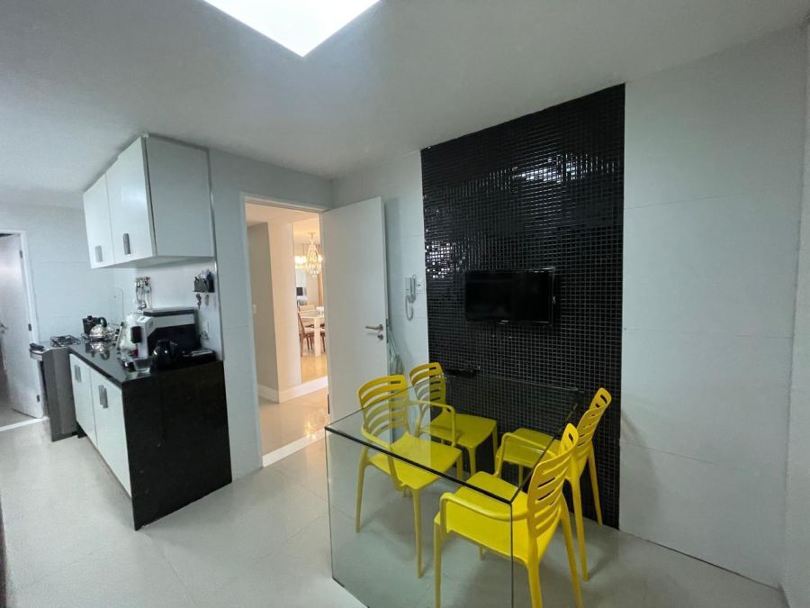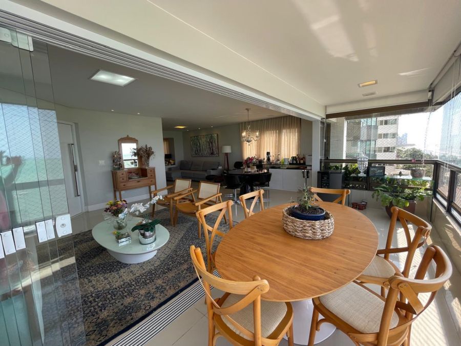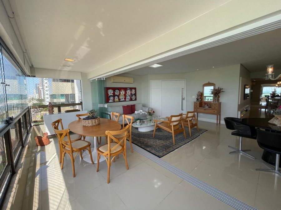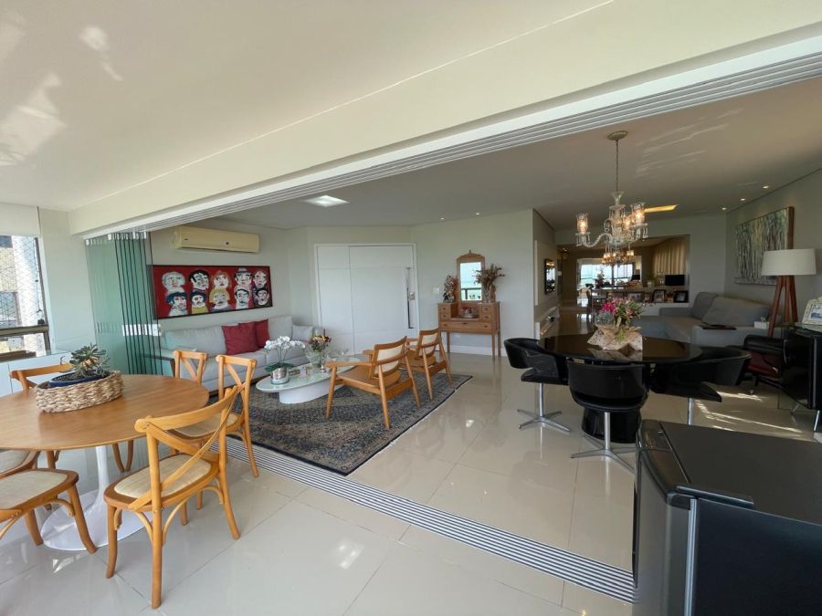 Com uma área privativa de 220 m², o imóvel destaca-se pela amplitude de seus ambientes. A planta é distribuída de forma inteligente, contando com duas salas amplas que se integram a uma varanda com vista panorâmica, proporcionando iluminação natural e ventilação constante. Na área íntima, o apartamento dispõe de quatro dormitórios, sendo duas suítes, além de um lavabo para atender à área social.
