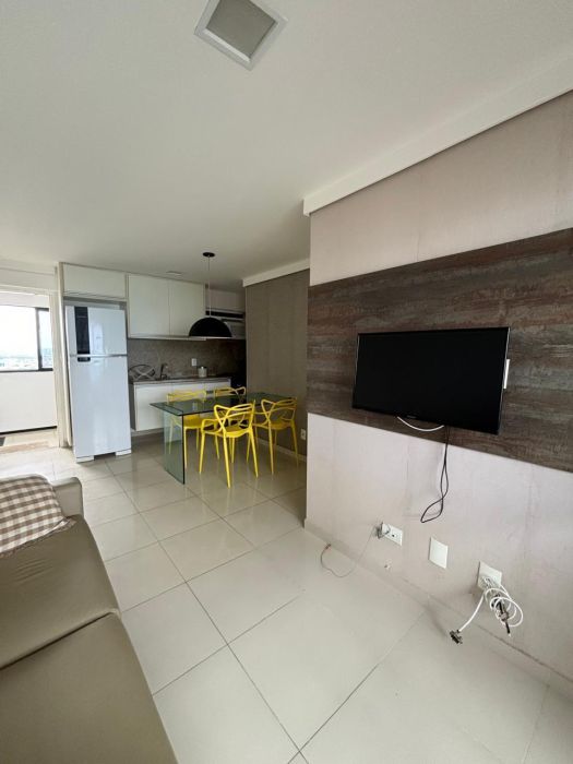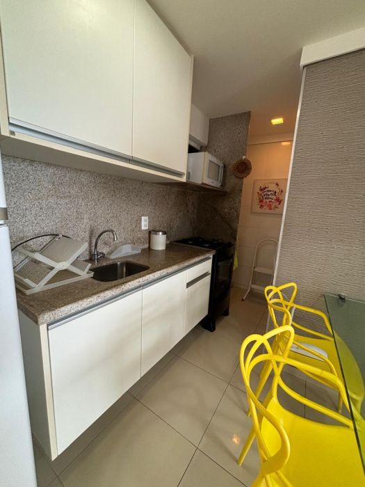 A unidade dispõe de dois dormitórios, sendo uma suíte, e dois banheiros no total. A área social é composta por uma sala integrada à varanda, proporcionando um ambiente arejado e com boa iluminação natural. A cozinha é completa e equipada com fogão, geladeira, freezer e micro-ondas, conectada a uma área de serviço que já conta com máquina de lavar roupa.