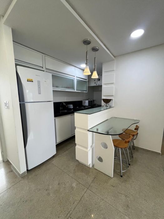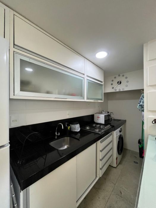 A cozinha segue o conceito americano, otimizando o espaço e a integração social. Está equipada com fogão e micro-ondas, além de contar com área de serviço privativa dotada de máquina de lavar roupas. O imóvel dispõe de uma vaga de garagem privativa.