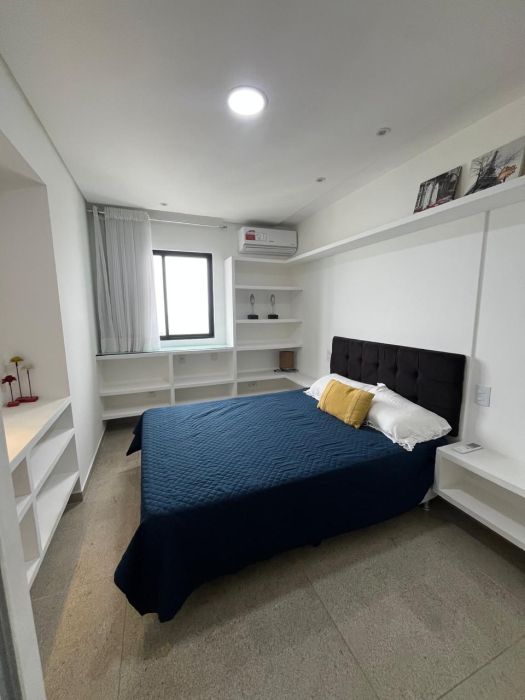 A unidade, totalmente mobiliada e pronta para ocupação, apresenta uma planta funcional composta por dois dormitórios, sendo uma suíte, banheiro social e sala de estar integrada. A varanda e a sacada proporcionam uma vista panorâmica da região, favorecendo a ventilação natural. O ambiente interno é climatizado com ar-condicionado e equipado com itens de conveniência, incluindo televisão, aparelho de som e roupas de cama.
